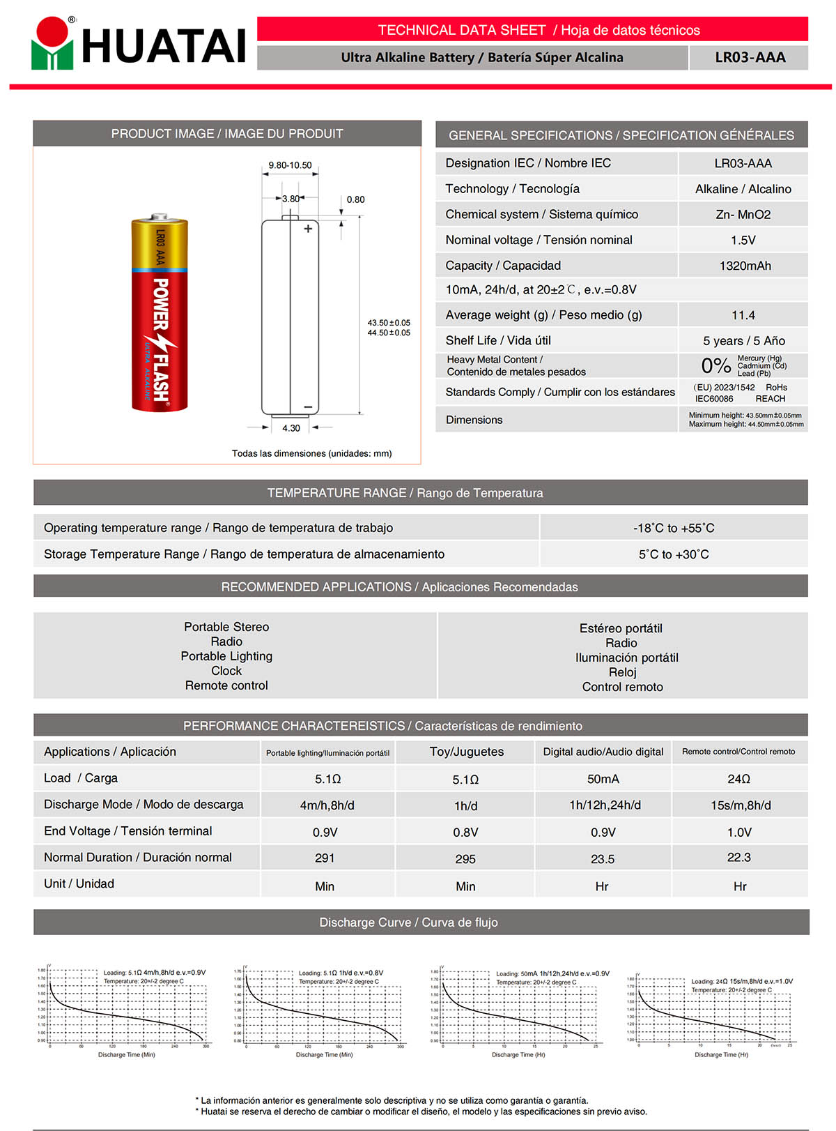 AAA 0%Hg Alkaline 1.50V 11.2±0.2g 9.8-10.5mm 43.5-44.5mm